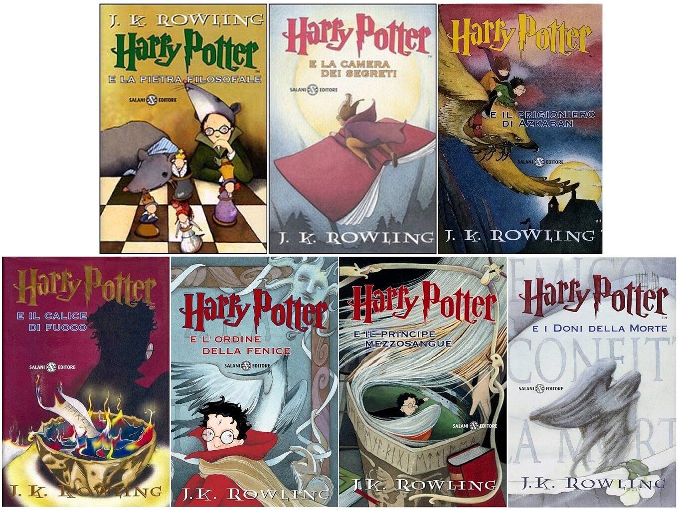 Saga completa di Harry Potter. Sette volumi Edizioni Salani, della prima serie, con le traduzioni originali di Marina Astrologo e Beatrice Masini, con copertina rigida e sovraccoperta. Segnalo, in qualche caso, la presenza di lievi tracce d’uso sui bordi delle sovraccoperte, ma i volumi sono integri e completi, molto ben conservati, senza pieghe, strappi o scritte.